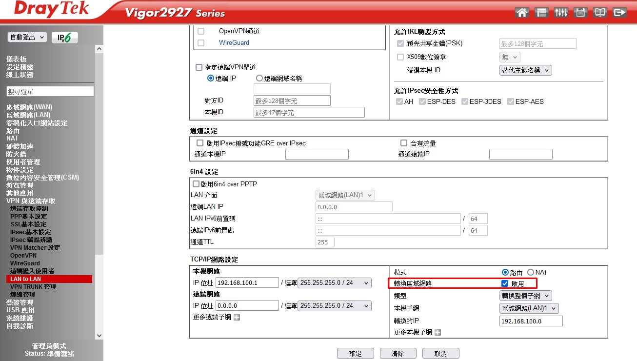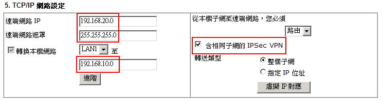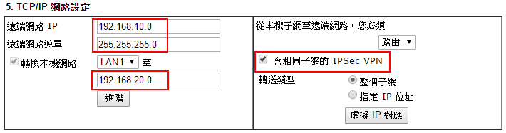 6. 先將右邊含相同子網的 IPSec VPN選項打勾,接著回到遠端網路IP欄位輸入 Vigor2925A 的虛擬網段192.168.10.0,轉換本機網路 LAN1 至 192.168.20.0 也就是 Vigor2925B 的虛擬網段。