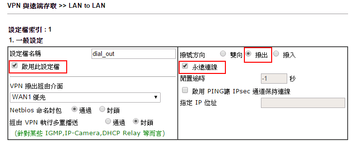 4. 登入 Vigor2925B,此台設定為 VPN 撥出方,點選 " VPN 與遠端存取 > LAN to LAN > 索引編號1 ",輸入設定檔名稱後勾選啟用設定檔,撥號方向選擇為撥出,將永遠連線打勾。