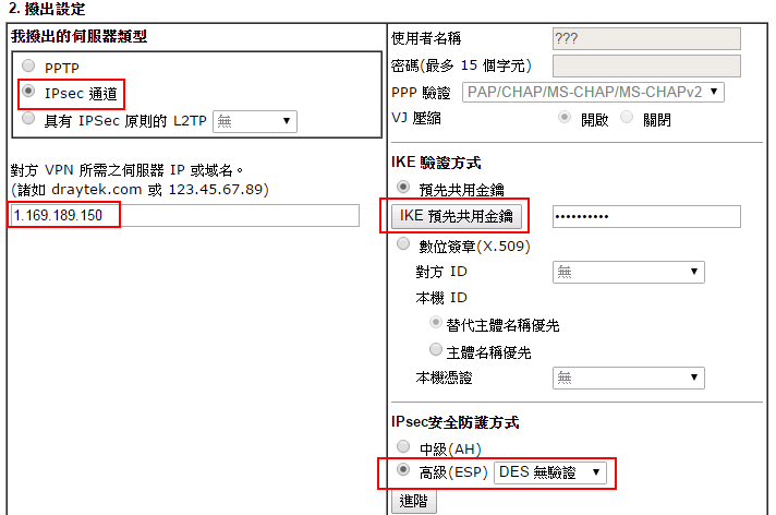 5. 撥出伺服器類型勾選 IPSec 通道,並輸入 Vigor2925A 的 WAN IP 位址,點選 IKE預先共用金鑰後輸入 VPN 密碼,將 IPSec 安全防護方式修改為高級。