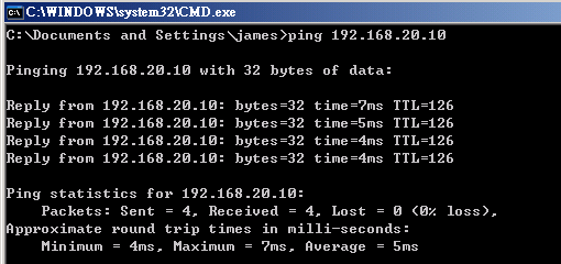8. 使用 Vigor2925A 區網下的電腦,ping 192.168.20.10,有回 ping 則代表 Vigor2925A 已可與 Vigor2925B 區網下的電腦互通。