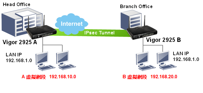 如下圖,假設 Vigor2925A & Vigor2925B 兩個區網下各有一台電腦 IP 為192.168.1.10,首先在 Vigor2925B 建立一組 VPN 設定檔,並指定一組不同於原本網段的虛擬網段給Vigor2925B(這裡使用192.168.20.0),當 Vigor2925A 區網下的電腦 192.168.1.10 要去存取 Vigor2925B 區網下的 192.168.1.10 時,只要輸入剛才設定的虛擬網段 IP 192.168.20.10,就能透過VPN通道連接到 Vigor2925B 底下的192.168.1.10,同樣的 Vigor2925A 也要建立一組虛擬網段(範例使用192.168.10.0),當 Vigor2925B 的電腦要來存取 Vigor2925A 底下的電腦(192.168.1.10)時,只要輸入192.168.10.10 即可進行溝通,如此就可以達成同網段雙向存取的效果。
