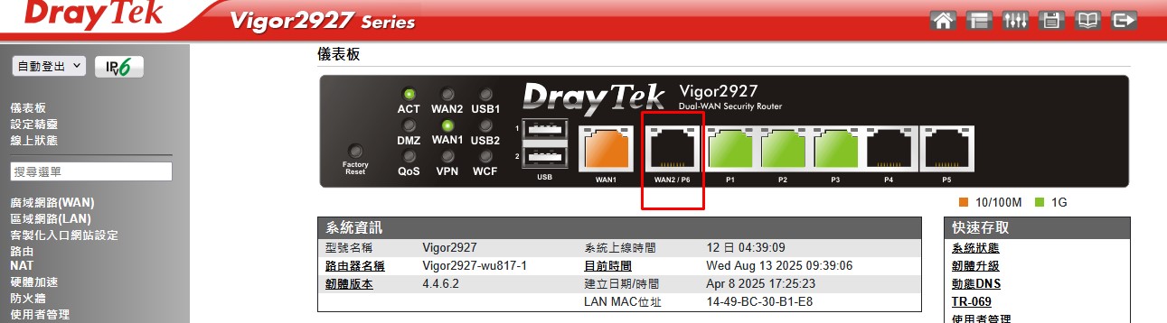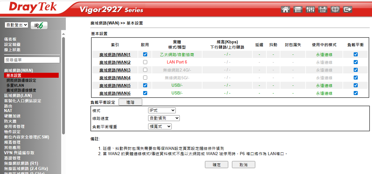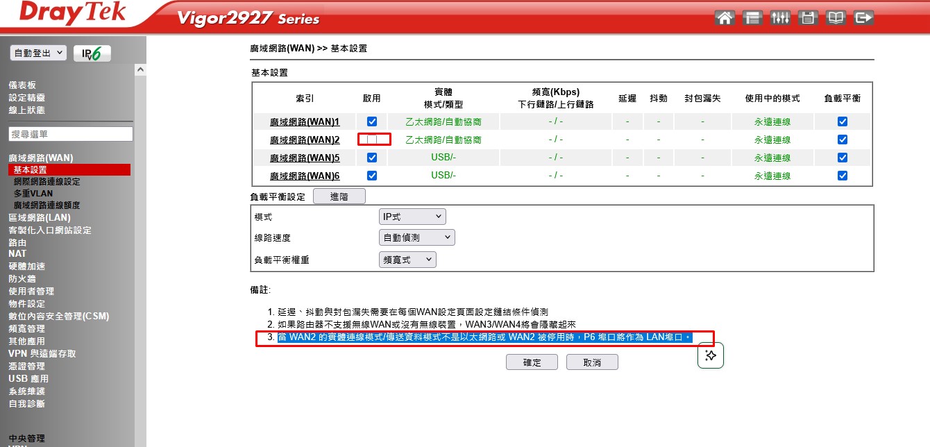 當 WAN2 的實體連線模式/傳送資料模式不是以太網路或 WAN2 被停用時,P6 埠口將作為 LAN埠口。