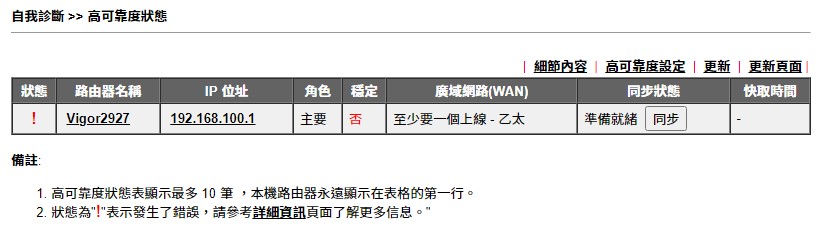 高可靠度狀態表顯示最多 10 筆 ,本機路由器永遠顯示在表格的第一行。